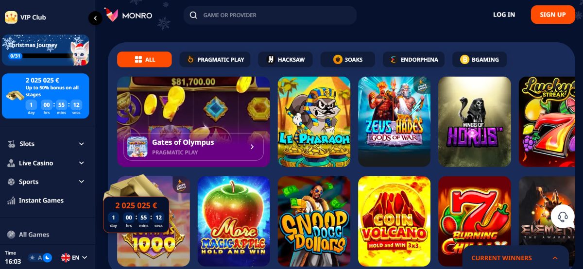 Monro Casino on oma mängijatele valikus tuhanded kasiino mängud, mis pärinevad valdkonna tipp-pakkujatelt. Platvormilt leiad mänguautomaadid sellistelt tuntud tootjatelt nagu Nolimit, Thunderkick, Push Gaming, Wazdan ja 3Oaks, tagades laia valiku nii klassikaliste kui ka uuenduslike mängude austajatele.